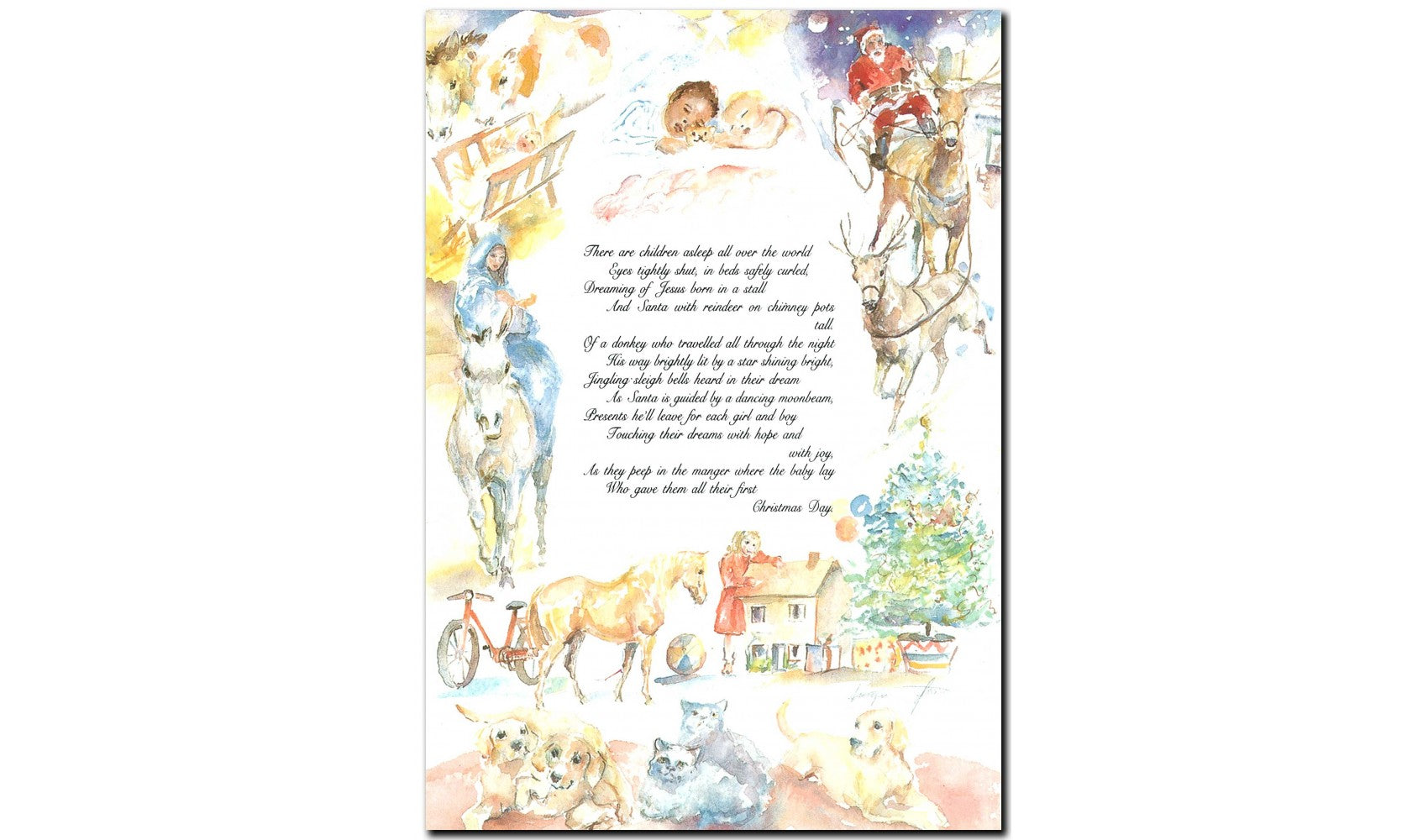 And Santa with reindeer on chimney pots tall.